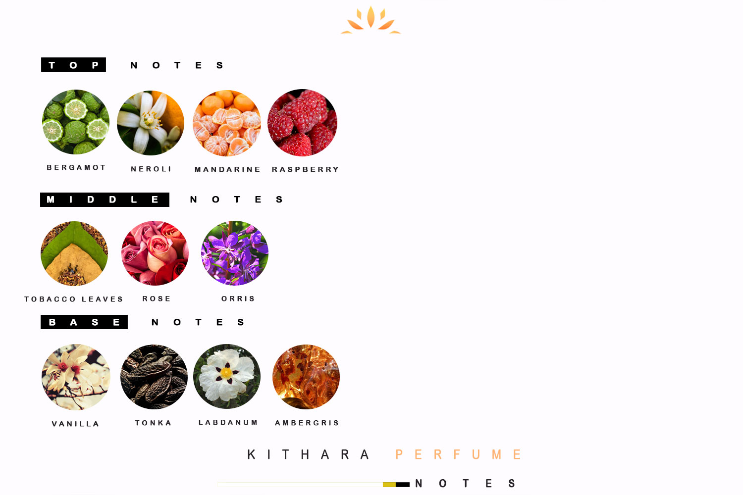 من أول شمة، يأخذك كيثارا في رحلة حالمة. تتفجر المقدمة بمزيج ساحر من توت العليق العصيري، البرغموت الحاد، المارماليد الحلو، النيرولي الدافئ، والماندرين المشمس. افتتاحية كالأوبيريتورا، تدعوك لاستكشاف تفاصيله الغنية.