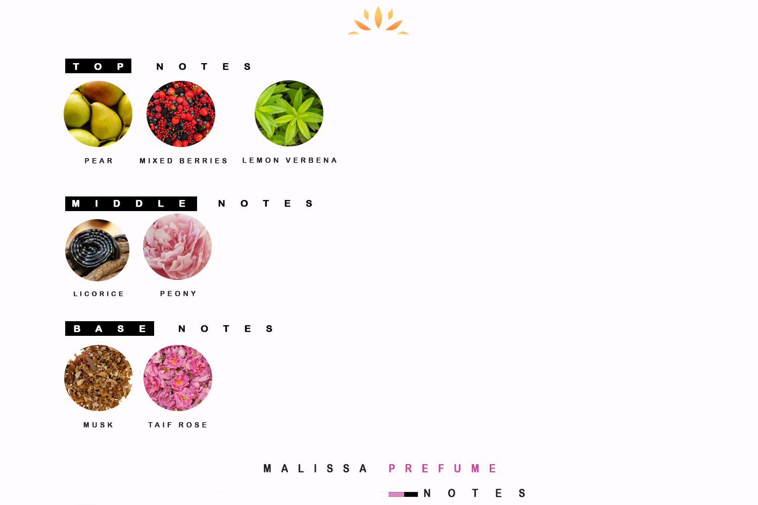 في المجتمع الفرعوني، كانت ماليسا امرأة حكيمة، وفي الثقافة اليونانية القديمة كانت نحلة العسل، رمزًا للحكمة عبر ثقافات متعددة. العطر هادئ ومتوازن، مع انتقال سلس بين النفحات، ويضفي هالة قوية وثابتة.