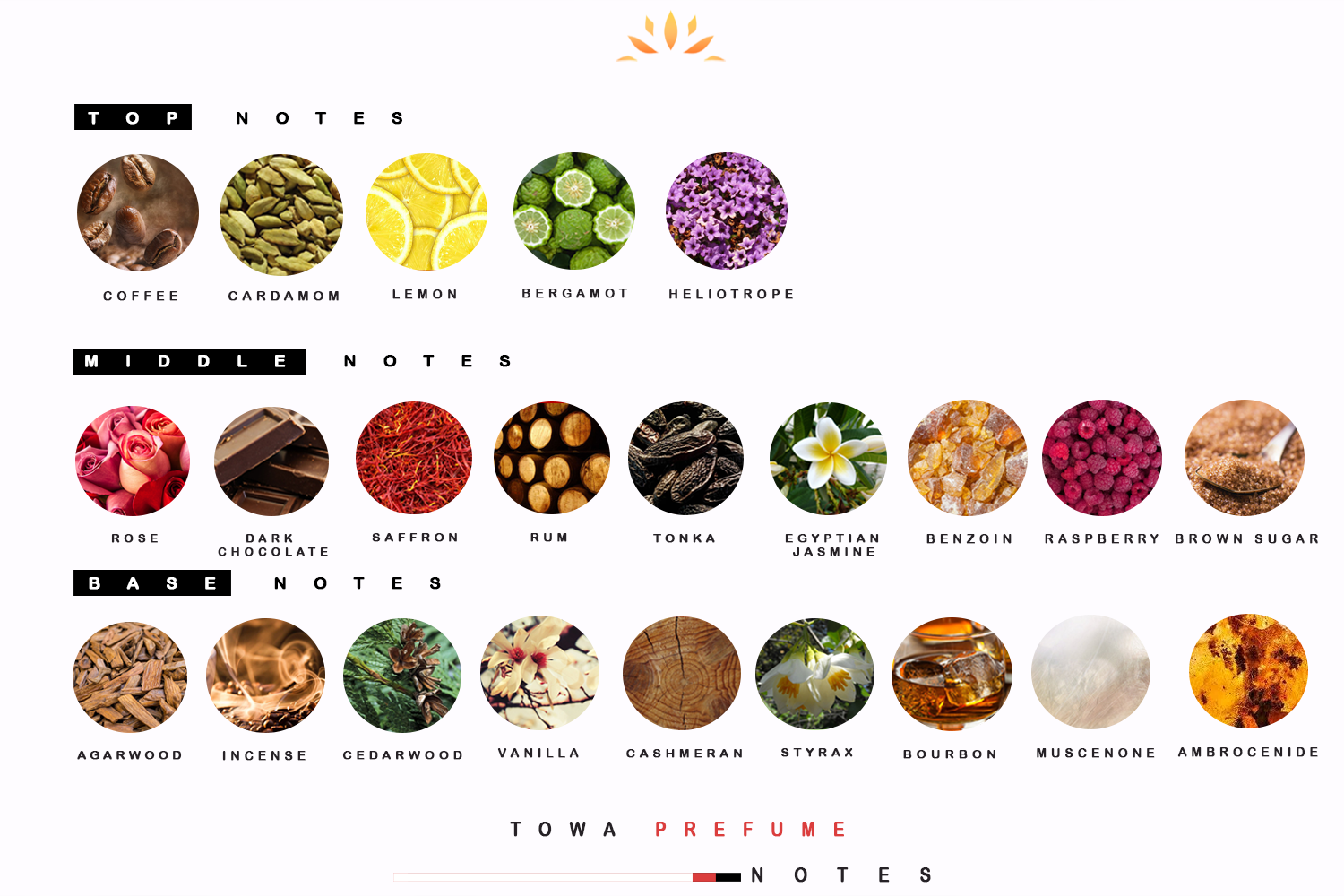 القلب: ورد، مستخلص ياسمين مصري، توت العليق، بنزوين، زعفران، تونكا، سكر بني، شوكولاتة داكنة، رم